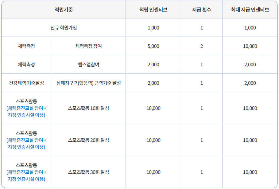 적립이 가능한 인센티브는 최대 5만 포인트이며, 상품권으로 전환이 가능한 포인트는 1만 포인트입니다. 신규회원가입하면 1,000포인트 지급되며, 체력측정에 참여하면 5,000포인트가 2회 지급되며, 체력증진교실 참여하고 지정인증시설을 이용하여 스포츠활동에 참여하면 10,000포인트가 지급됩니다. 단 스포츠 활동은 1주에 1회만 인정이 되며 매주 월요일 11시에 초기화됩니다.